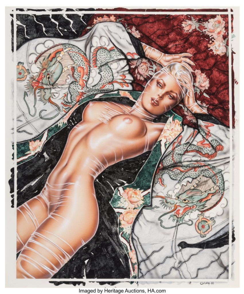 FEATURED ART OF THE MONTH OLIVIA DE BERARDINIS “MODERN LOVE”!!! Go GET HER! ONE OF THE RAREST OF THE RARE FROM A MAJOR COLLECTION IN CALIFORNIA NOW UP AT HERITAGE AUCTIONS ILLUSTRATION SIGNATURE AUCTION APRIL 21 2026. (NOTE: I OWN OVER 60 WORKS BY OLIVIA AND TRULY THIS IS A MASTERPIECE. I BELIEVE ARTISTICALLY ONE OF THE BEST EXAMPLES OF HER WORK IN HER PRIME AT THE START OF HER PLAYBOY CAREER!). IT IS IMPRESSIVE. GO BID AT HA!
