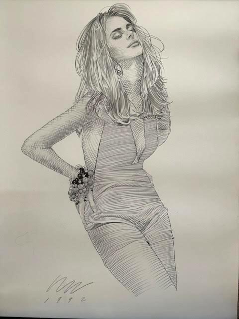 Supermodel & 1980s “Sports Illustrated” swimsuit icon, Paulina Porizkova. Huge 42″ x 31′ original drawing and wash on thick art paper. Signed and dated 1992.