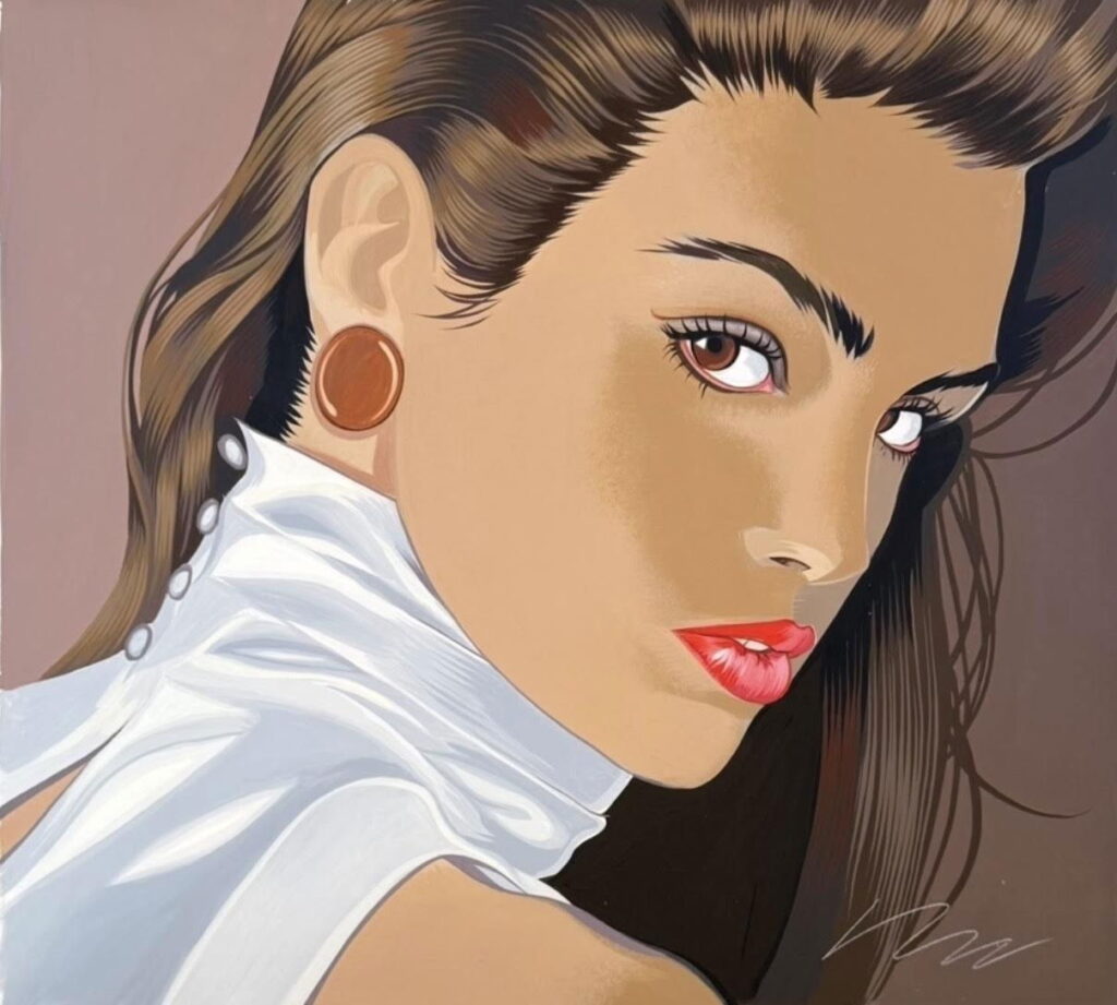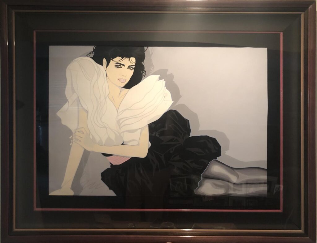 Title unknown and I don’t have the heart to open it. It is gorgeous. This gorgeous pinup fashion illustration fine art painting is an acrylic on board at a large size at approx 42″ x 30″ frame to 58″ x 45″. Anyone know her name? Reminds of actress Claudia Wells from “Back to the Future.”