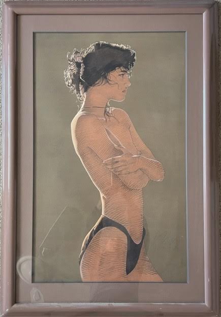 Original artwork from his Gina Sitting Pretty Series (NSFW) 1997. Mixed media on 37″ x 27.75″ heavy rag paper. The image is in Blue’s created Margin about 2″ around. Gina is about 28″ x 18″.