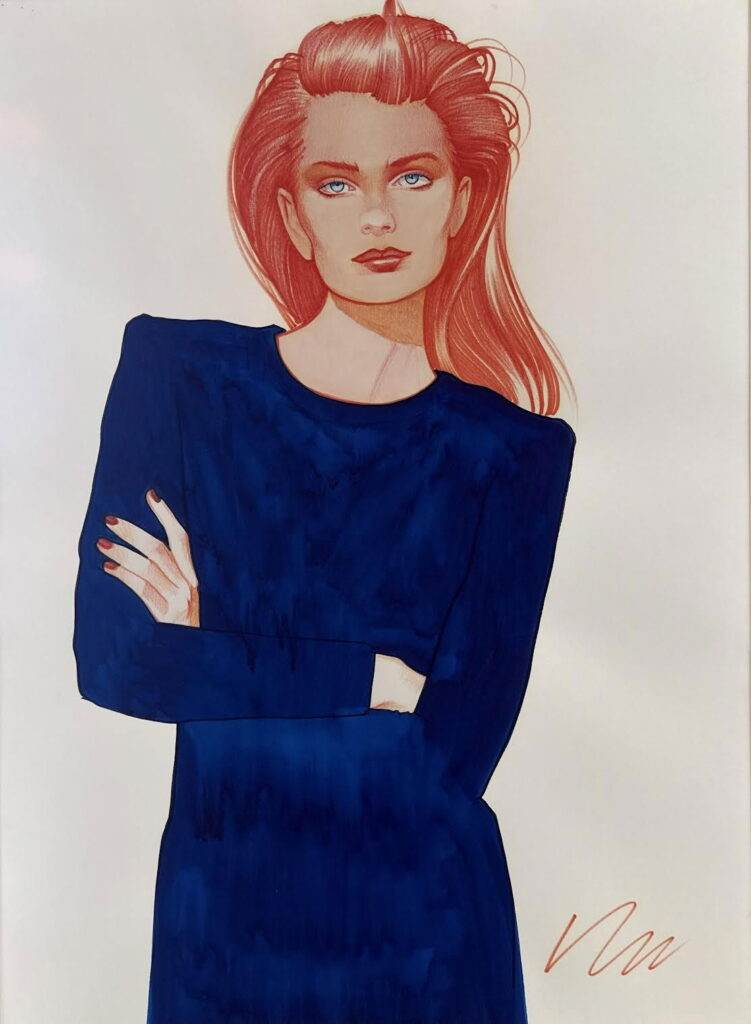 Robert D. Blue original featuring supermodel Paulina Porizkova. Beautiful fashion illustration. Watercolor on 22″ x 30″ Heavy Rag paper. c. 1992